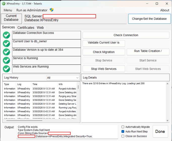 1) Open up SQL Server Management Stsudio (SSMS) of where ever the XPressEntry database is located. In the event that you do not know where the database is, you can check XPressEntryConfigTool (aka XPressEntryDatabaseTool) to determine the connection string. The red outlines are where you will find your information.