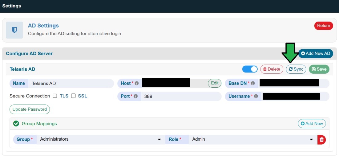 Finally, after you have added group mapping, click “Sync” to finish configuring the AD Settings.