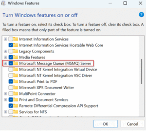 - When logging in as a domain user with administrator privileges, go back to Add/Remove Windows Features / Turn Windows Features On/Off and re-enable the feature. The initializing context of the queue will be owned by the domain and being able to add/remove/delete queues.