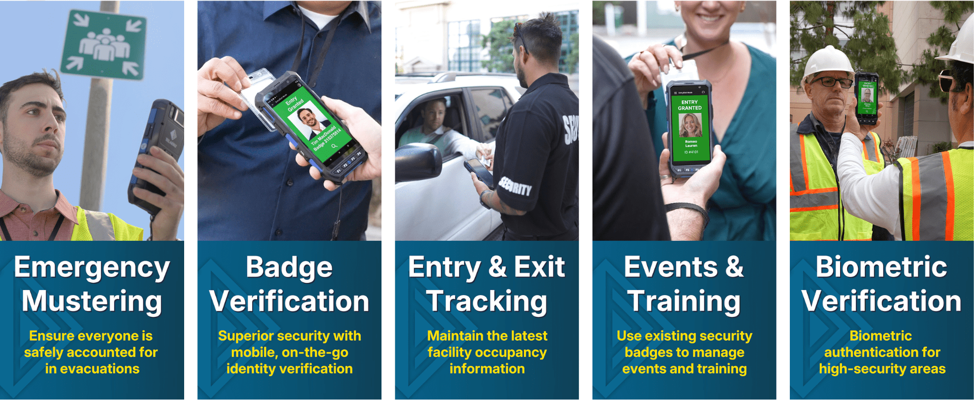 - HANDHELD BADGE VERIFICATION* – Validate permissions and authenticate identities on the go in locations where fixed readers are impractical, while maintaining real-time facility occupancy data.